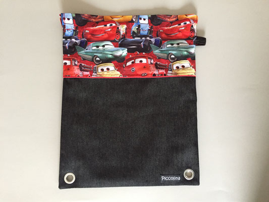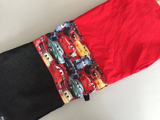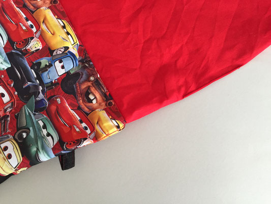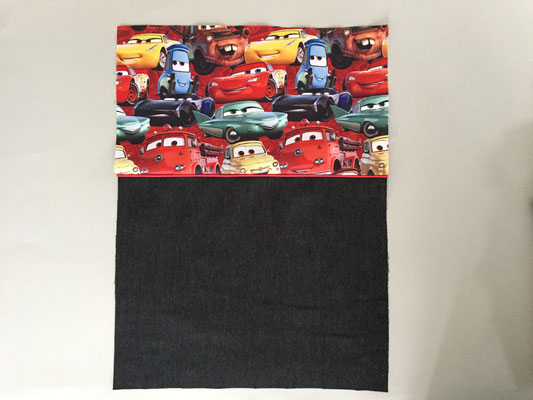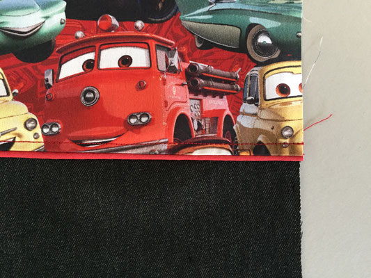 Legt dann das Cars Schnittteil rechts auf rechts auf das Jeansteil und näht es fest. Schlagt die Nahtzugabe Richtung Cars Stoff und steppt die Nahtzugabe ab.