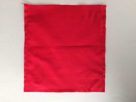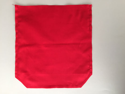 Bereitet nun das Futter vor, indem ihr die beiden Teile rechts auf rechts legt und an 3 Kanten zusammennäht. Am Taschbeutelboden näht ihr 5 cm große Ecken ab, die sind als Aussparung für die Ösen gedacht, die später eingearbeitet werden. An der langen Seite eine Wendeöffnung frei lassen.