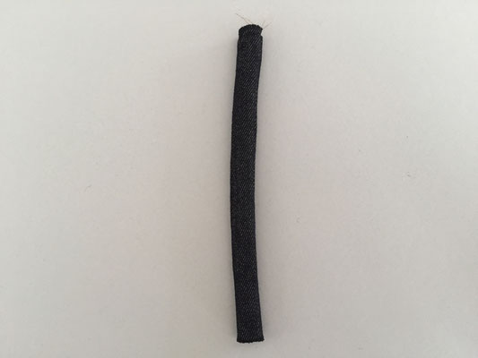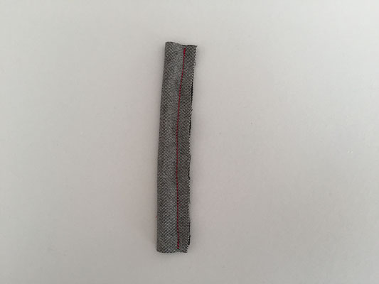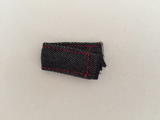Legt das kleine Jeansstoffteil rechts auf rechts aufeinander und näht es an der langen Kante zusammen. Wendet das Teil mit Hilfe einer Sicherheitsnadel auf rechts. Bügelt den Streifen glatt und steppt rechts und links ab. Faltet das Stück dann wie abgebildet schräg übereinander und heftet es zusammen.