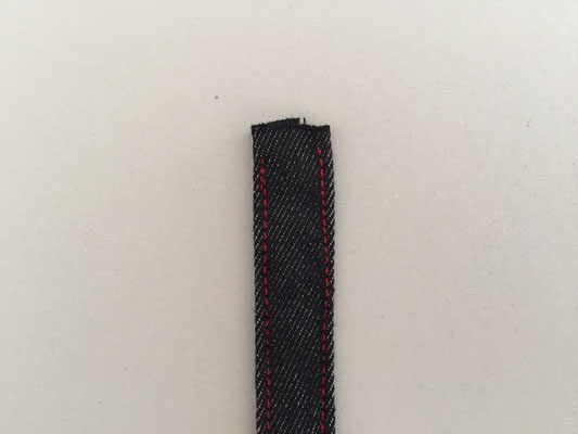 Näht das Paspelband an die lange Seite des Jeansstoffes. Wiederholt den Vorgang auch mit dem zweiten Jeansteil.